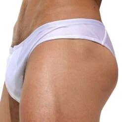 Slip de bain en microfibre extensible brillante. Coupe trÚs échancrée sur les fesses. Poche frontale préformée avec braguette factice. Ceinture élastique avec cordon de serrage intérieur. Fabriqué en Californie.