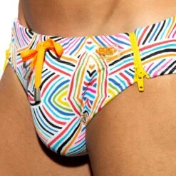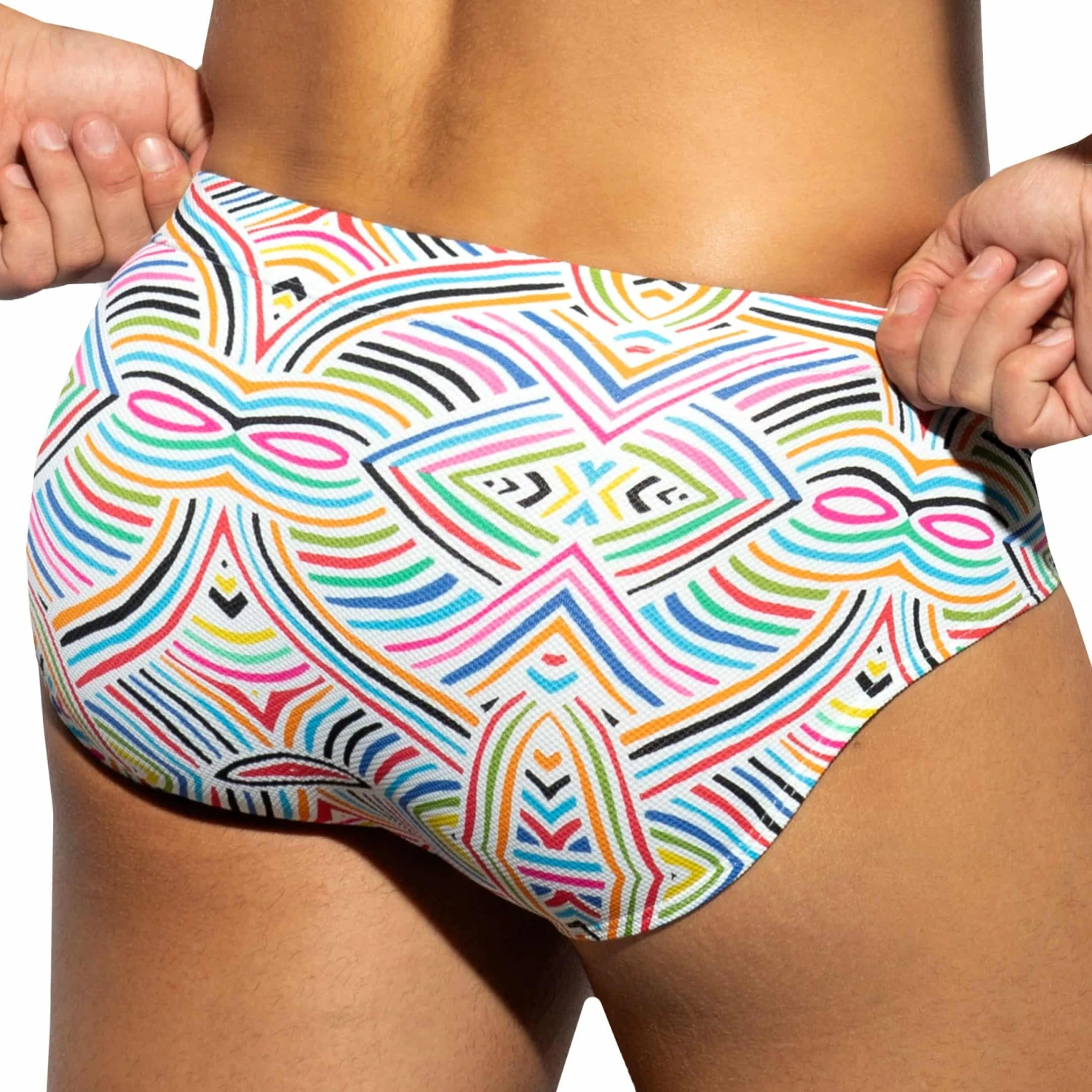 Slip de bain taille basse en microfibre piquée. Tissu Ecowave recyclé à partir de bouteilles en plastique. imprimé labyrinthe amusant et coloré. Design original avec fermeture éclair fonctionnelle de chaque cÎté. SystÚme Pack Up intégré avec mousse amovible pour plus de volume frontal. Logo ES Collection en silicone sur la hanche gauche. Ceinture élastique avec cordon de serrage.