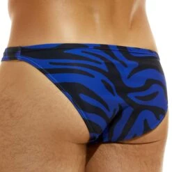 Slip de bain minimaliste super taille basse en microfibre extensible séchant rapidement. Imprimé tigré de couleur intense. Logo Modus Vivendi en silicone sur la fine ceinture élastique recouverte.