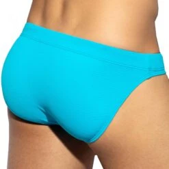 Slip de bain taille basse en microfibre piquée douce et légÚre de couleur intense. SystÚme Pack Up intégré avec mousse amovible pour plus de volume frontal. Ceinture élastique avec cordon de serrage de couleur contrastée. Logo ES Collection en silicone sur la hanche gauche.