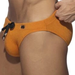 Slip de bain bikini taille basse en microfibre texturée légÚrement brillante. SystÚme Pack Up intégré avec mousse amovible pour plus de volume frontal. Poche frontale moulée sans couture pour un confort optimal. Ceinture élastique avec cordon de serrage de couleur contrastée. Logo Addicted en silicone sur la hanche gauche.