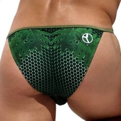 Slip de bain taille basse en microfibre séchant rapidement. Imprimé sublimé qui mettra en valeur votre anatomie. Coupe tanga trÚs sexy. Fabriqué en Californie.