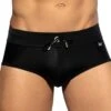 Slip de bain taille basse en microfibre douce et satinée comme du velours. Coupe tanga, sexy et ajustée. Poche frontale doublée opaque. Rivet métallique MV sous la fine ceinture élastique recouverte.