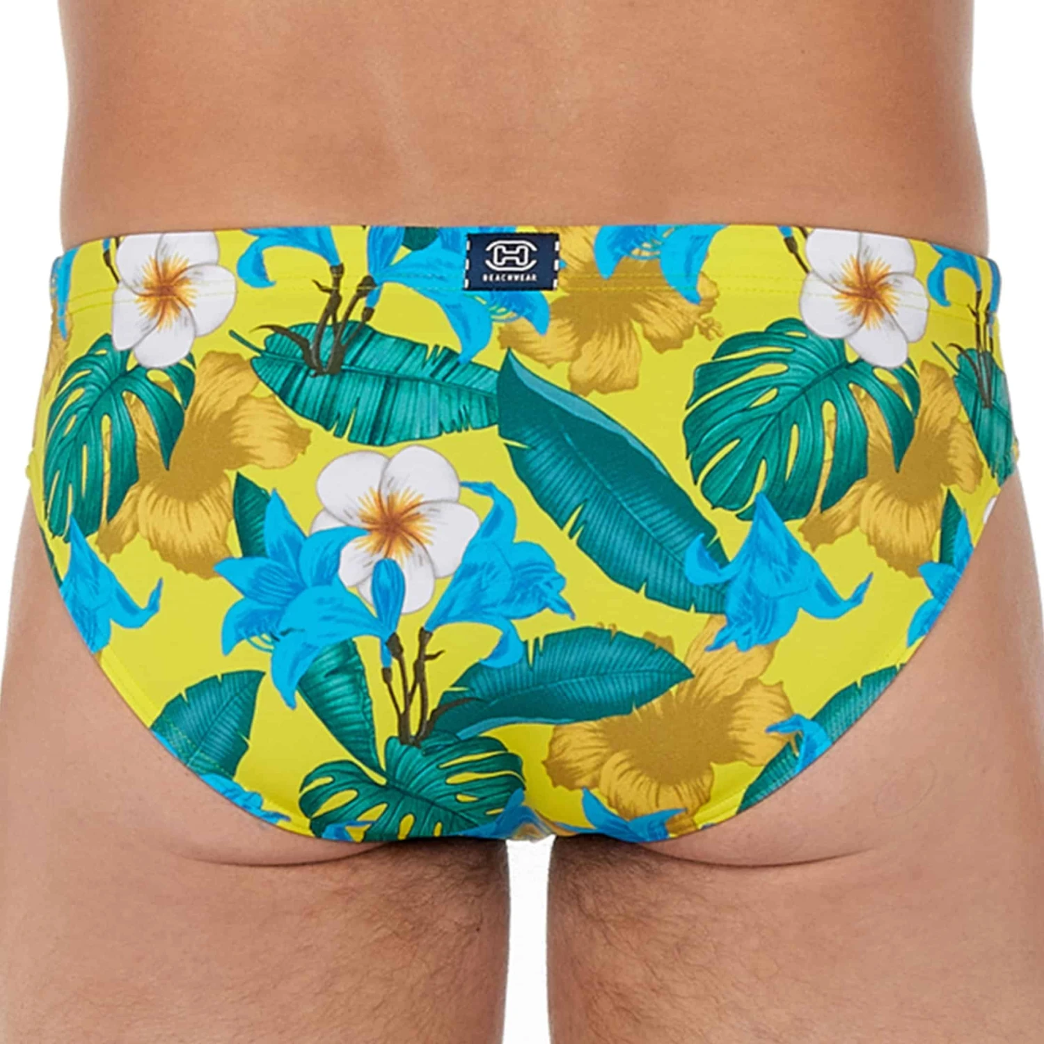 Slip de bain en microfibre stretch rĂ©sistante et opaque. ImprimĂ© tropical d’inspiration polynĂ©sienne, composĂ© de feuilles exotiques et de fleurs de TiarĂ©. Tissu italien de qualitĂ© supĂ©rieure certifiĂ© Oeko-Tex. DoublĂ© devant. Ceinture Ă©lastique avec cordon de serrage.