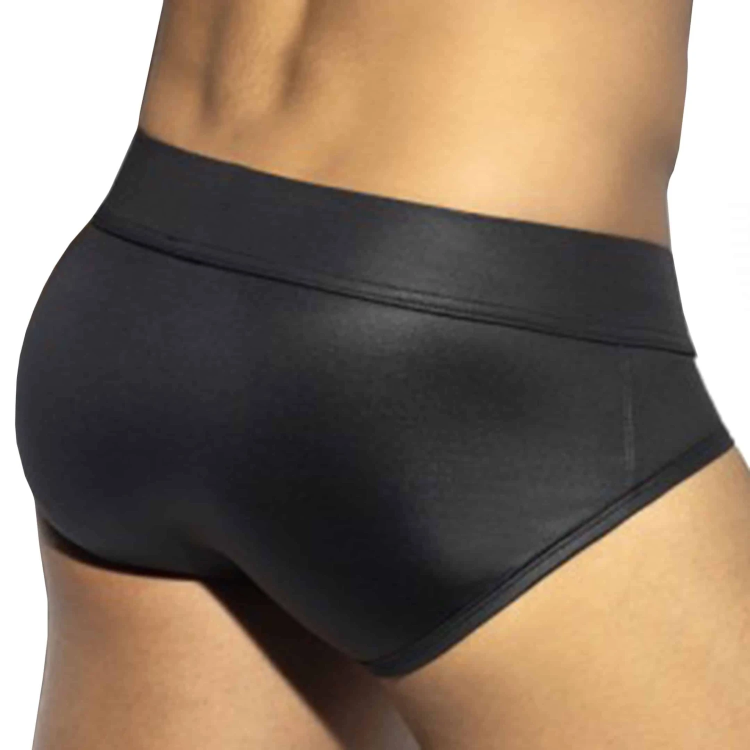 Slip en microfibre écologique provenant du recyclage de bouteilles plastique trouvées en mer Méditerranée. Aspect cuir pour un look trÚs fetish. Coupe taille basse ajustée. Ceinture élastique signée ES Collection.