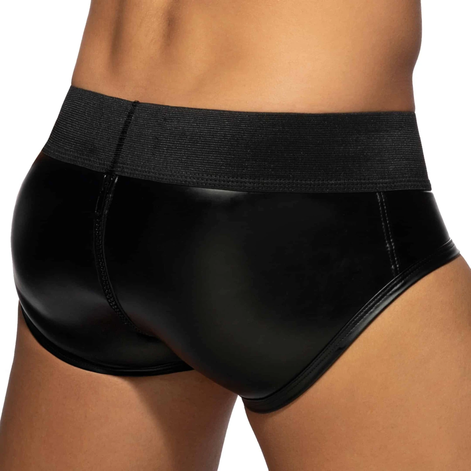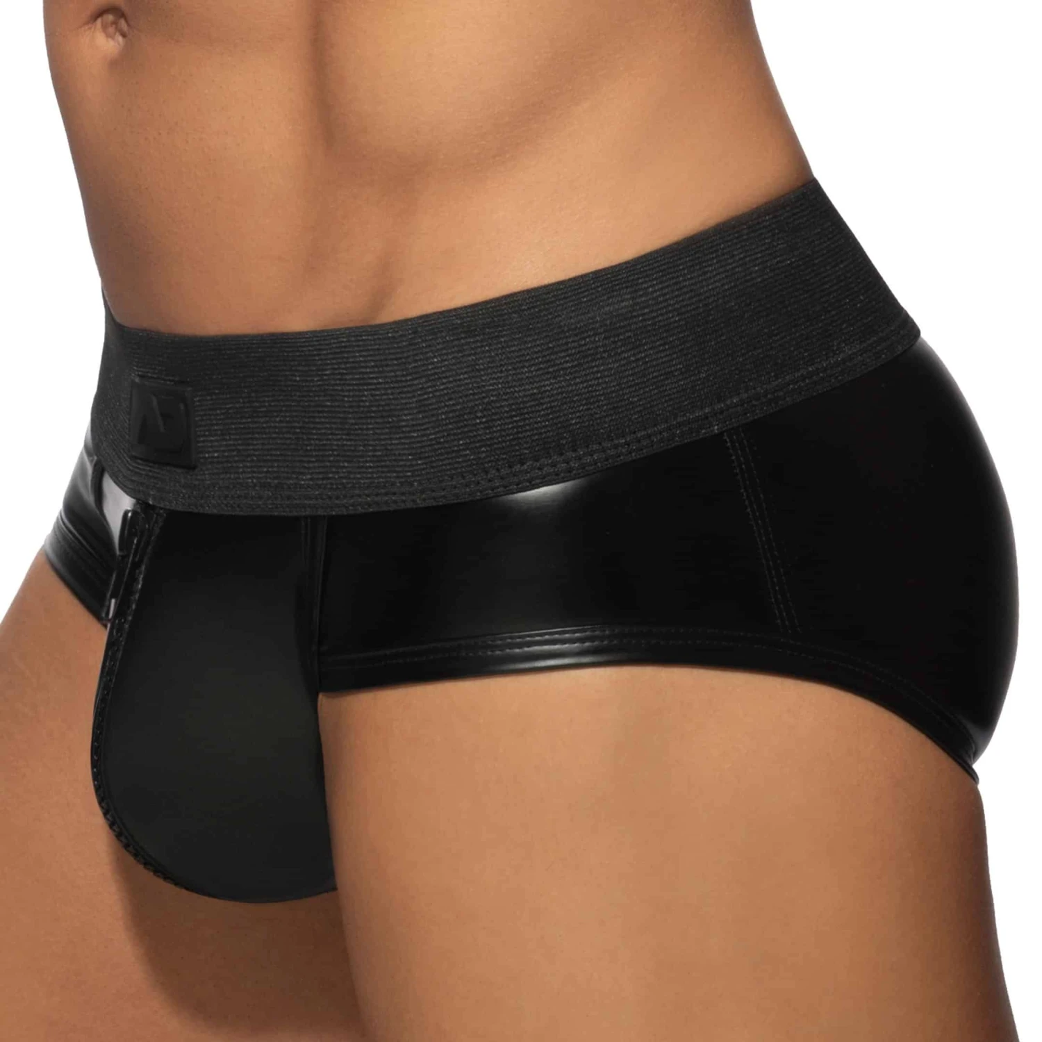Slip innovant en microfibre brillante imitant le caoutchouc, pour un look trÚs fetish. Fermetures Eclair fonctionnelles devant et derriÚre. Technologie RingUp intégrant un anneau cock ring en silicone (diamÚtre 5 cm, amovible par bouton pression) pour une érection plus dure et plus longue. Ceinture élastique extra-large signée du logo AD en silicone.