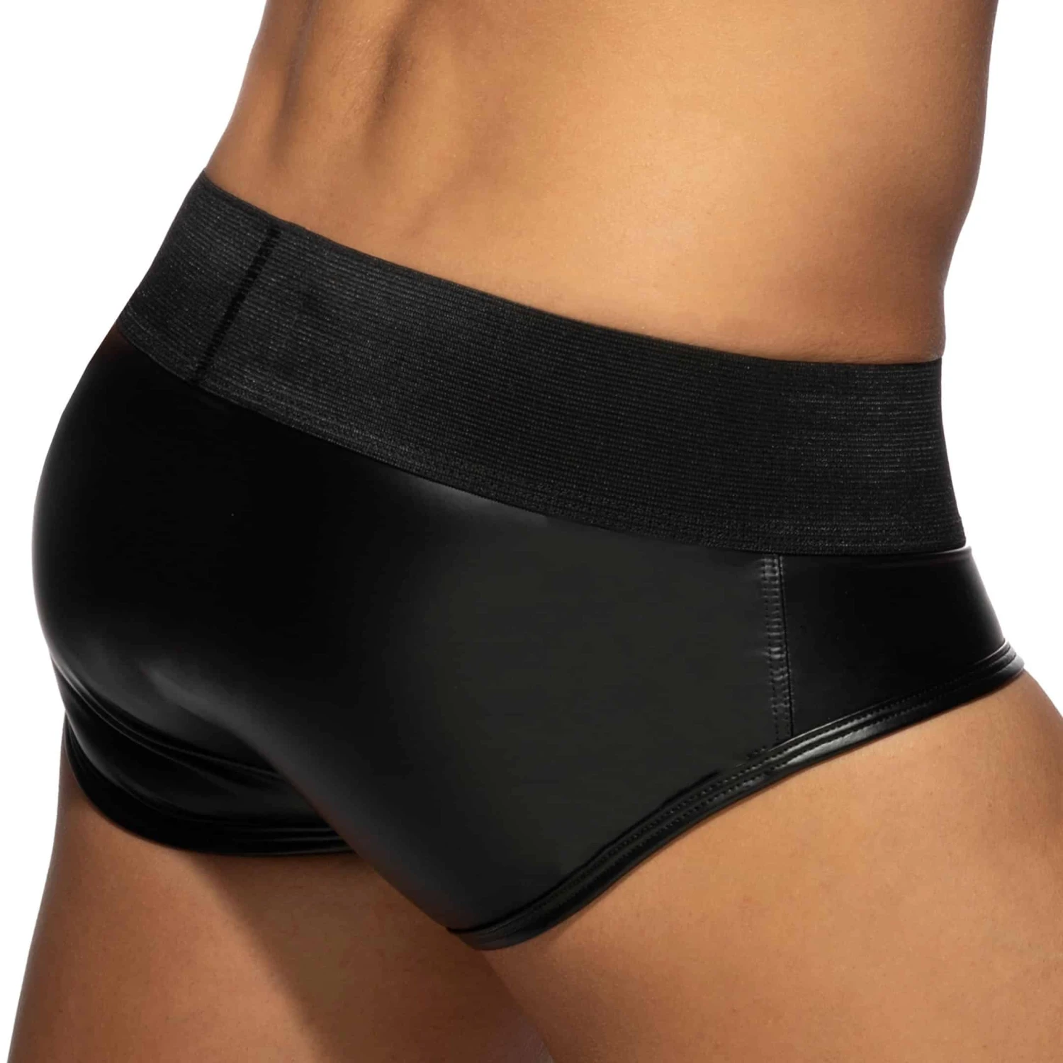 Slip innovant en microfibre brillante imitant le caoutchouc, pour un look trÚs fetish. Fermeture Eclair fonctionnelle sur la poche frontale. Technologie RingUp intégrant un anneau cock ring en silicone (diamÚtre 5 cm, amovible par bouton pression) pour une érection plus dure et plus longue. Ceinture élastique extra-large signée du logo AD en silicone.
