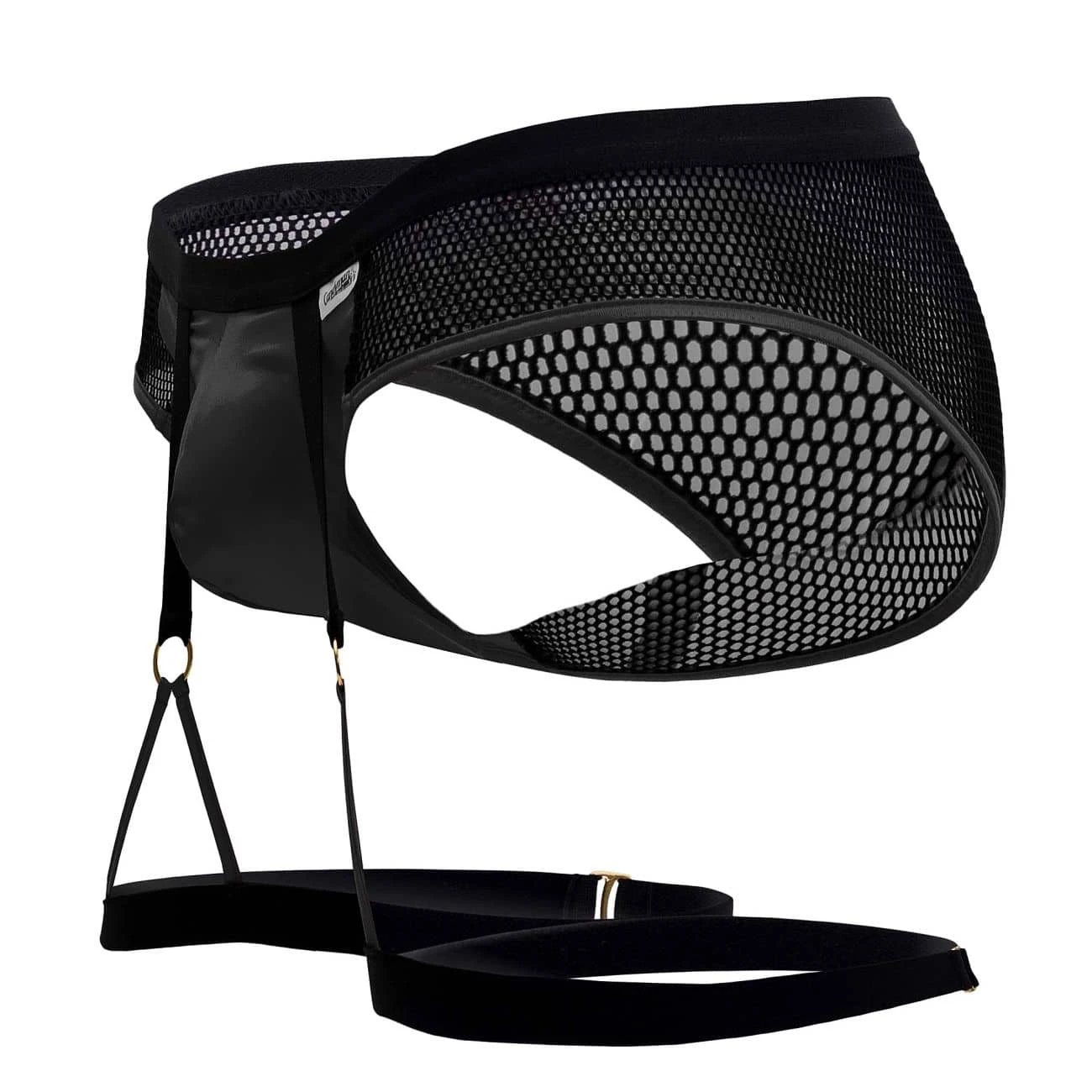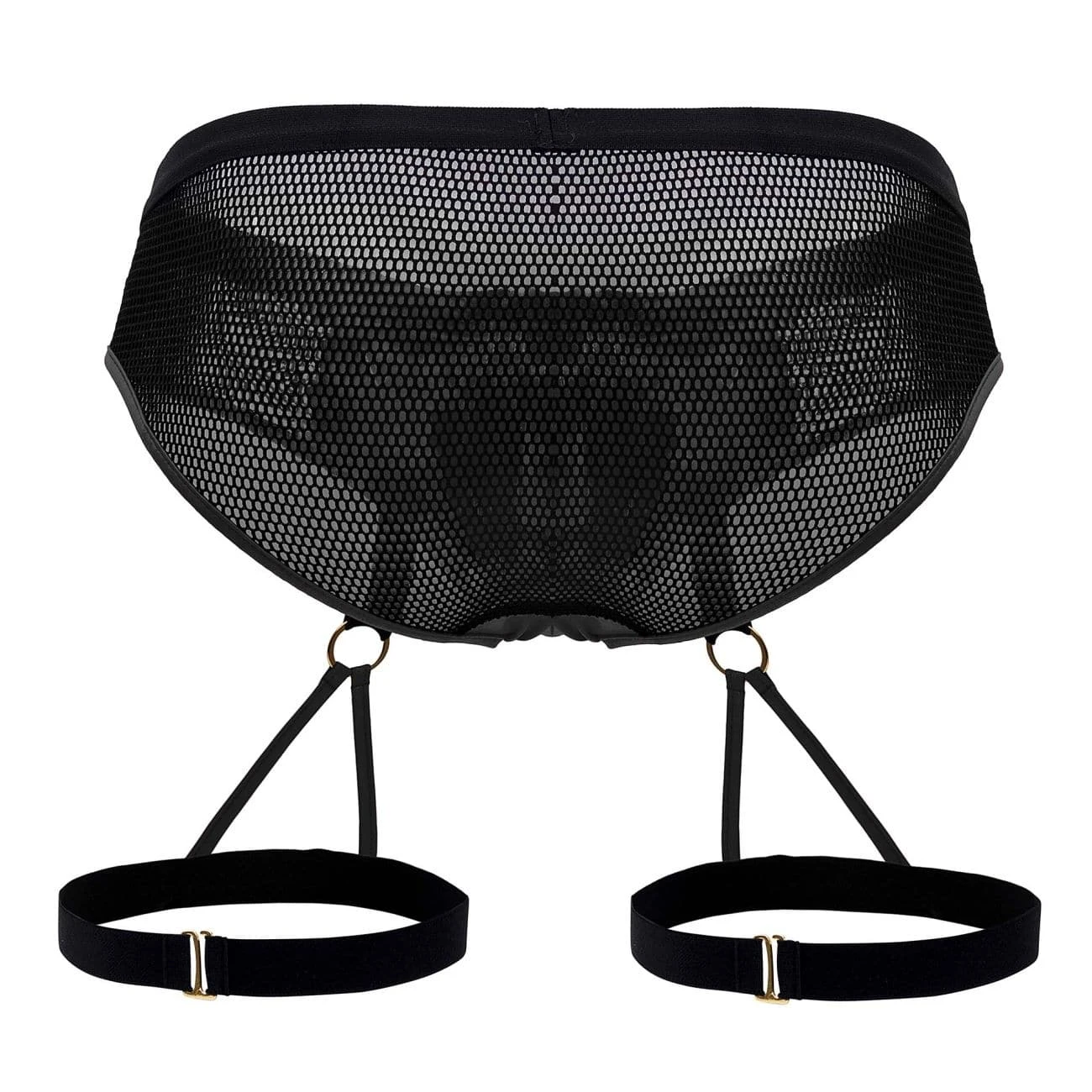 Slip très sexy en résille transparente. Jarretière constituée de bandes élastiques reliées par des anneaux métalliques dorés. Poche frontale opaque en simili cuir.
