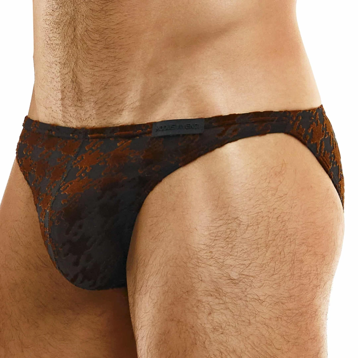 Slip taille basse minimaliste et trÚs luxueux en microfibre semi-transparente. Motif pied-de-poule en velours. Logo Modus Vivendi en silicone sur la fine ceinture élastique recouverte.