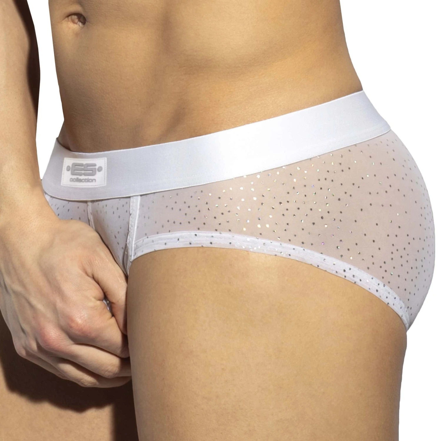 Slip taille basse trÚs ajusté en voile recouvert de paillettes. Tissu fin, extensible et transparent. Belle poche frontale non doublée. Ceinture élastique avec étiquette ES Collection en silicone.