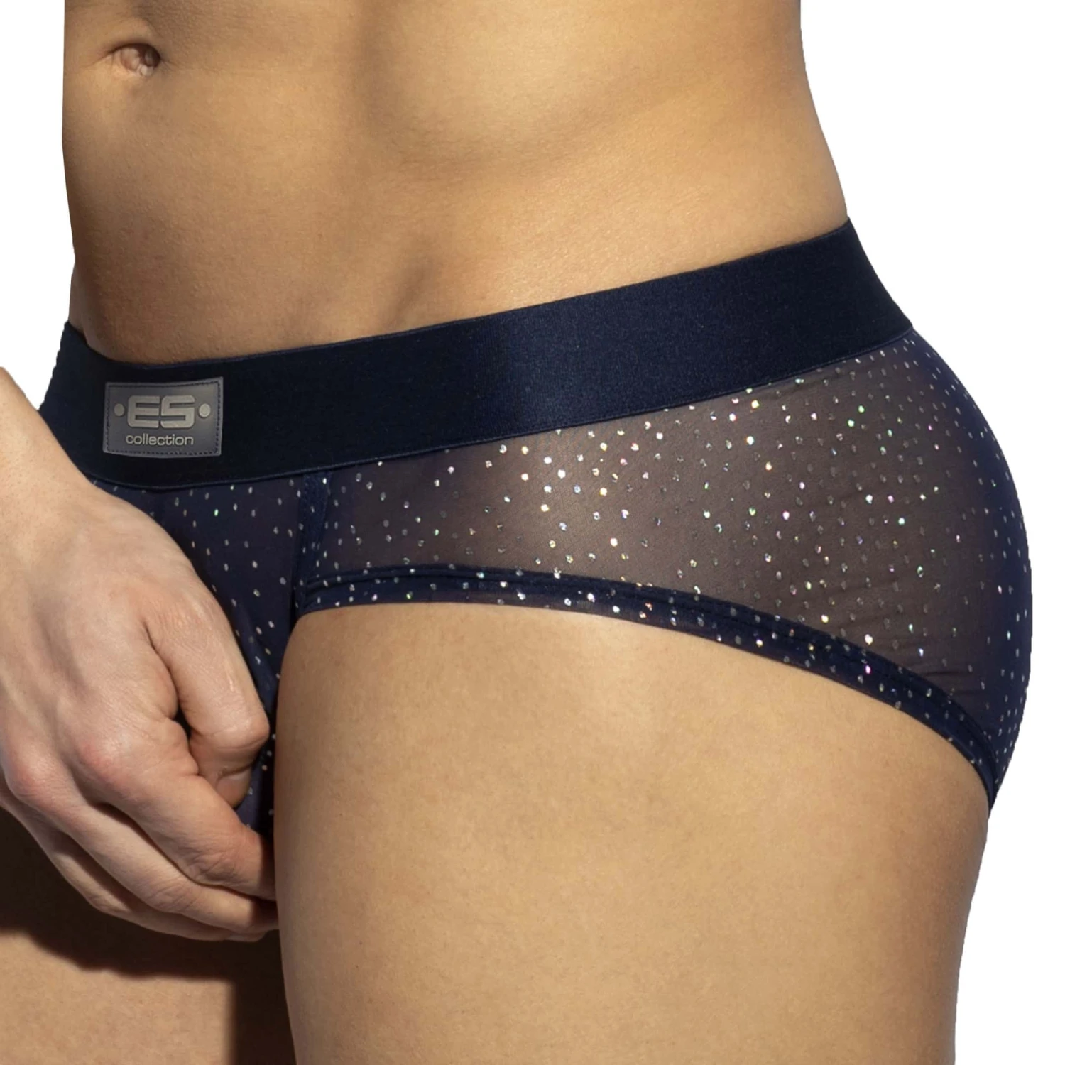 Slip taille basse trÚs ajusté en voile recouvert de paillettes. Tissu fin, extensible et transparent. Belle poche frontale non doublée. Ceinture élastique avec étiquette ES Collection en silicone.