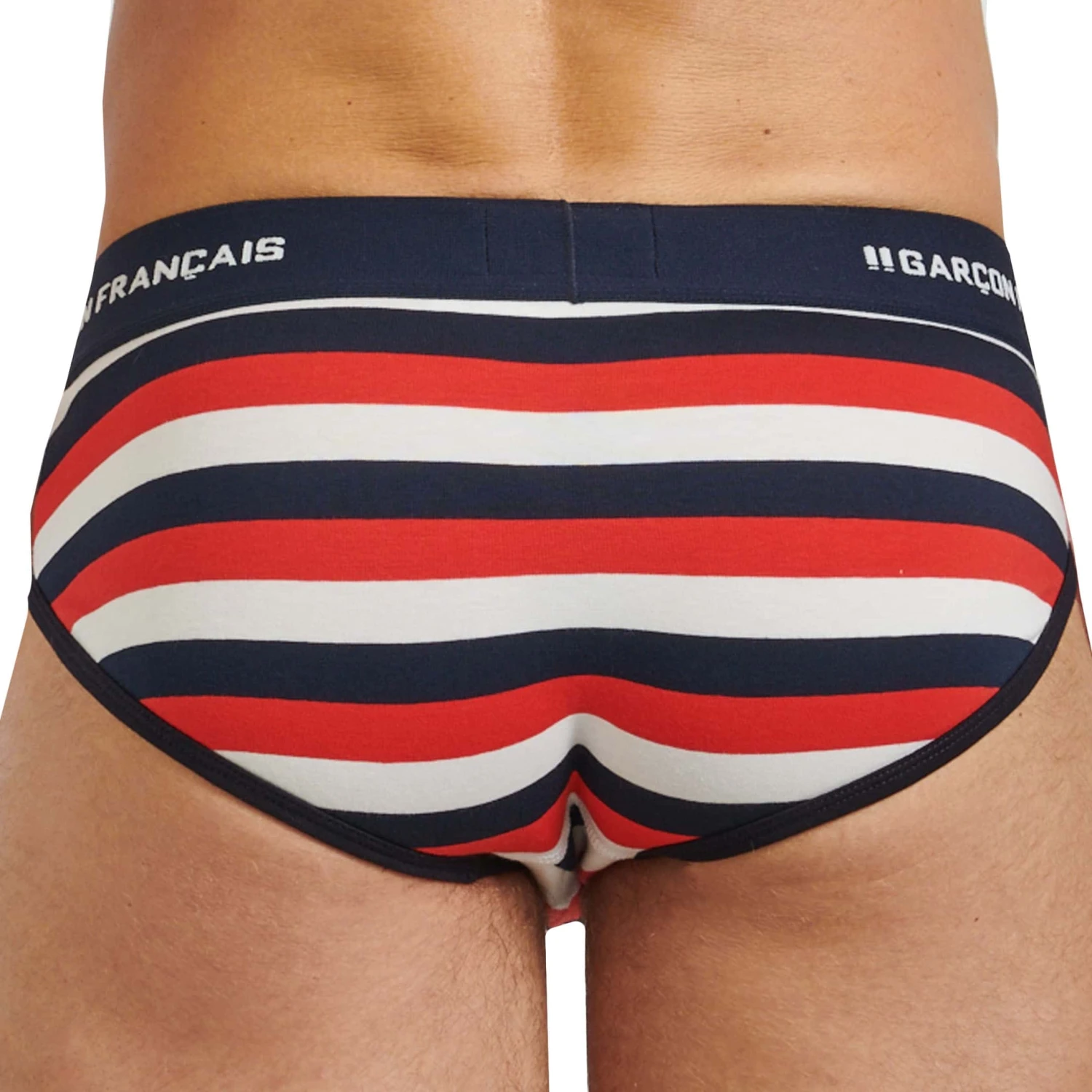 Slip taille basse trÚs ajusté en coton doux, souple et confortable. Rayures avec grande qualité de finition. Nouvelle version avec une poche plus ergonomique et un arriÚre enveloppant mieux les fesses. Belle ceinture Garçon Français. Fabrication 100% française.