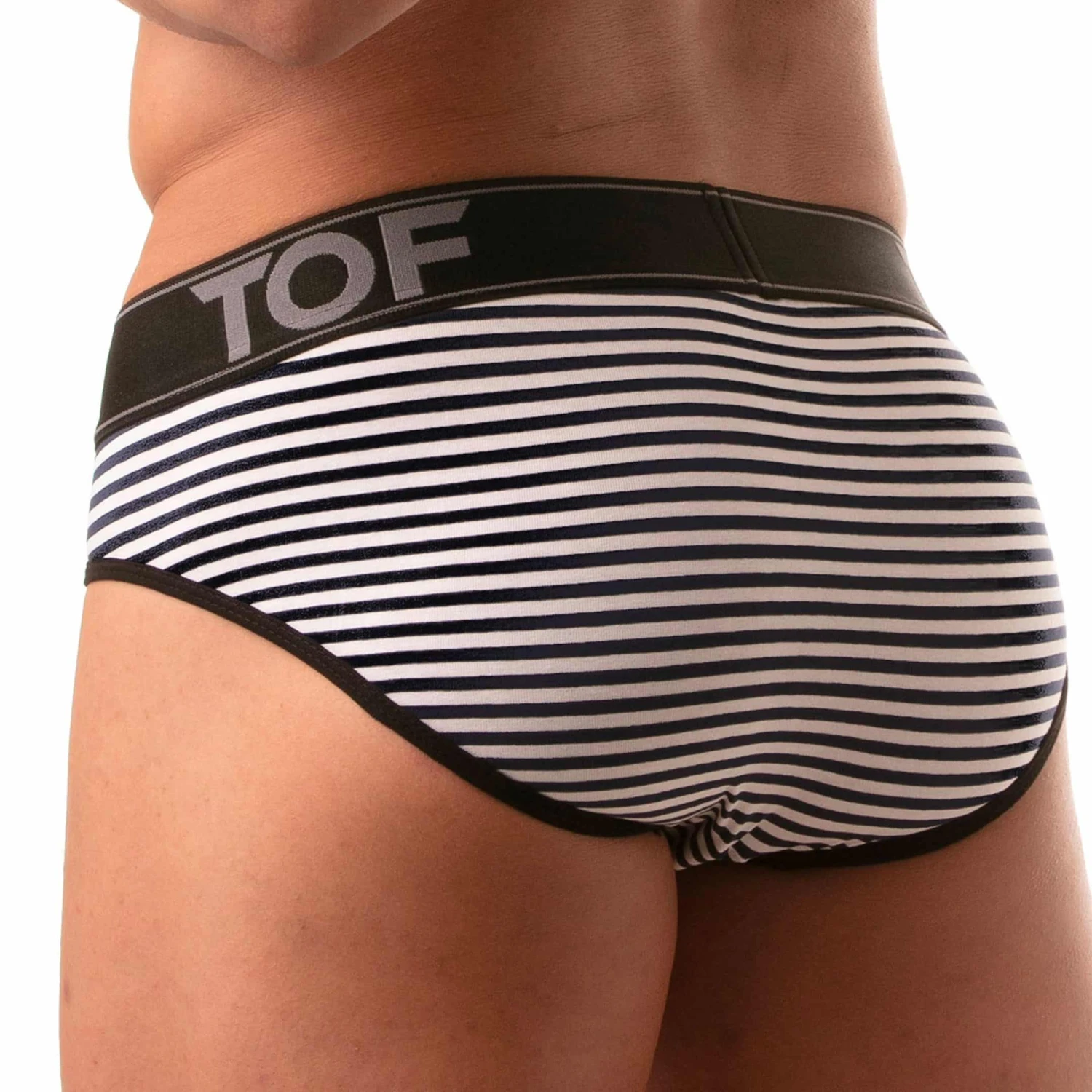 Slip taille basse en coton stretch imprimĂ© d’une Ă©lĂ©gante rayure façon mariniĂšre. Grande poche frontale non doublĂ©e. Ceinture Ă©lastique jacquard signĂ©e TOF. Fabrication française.