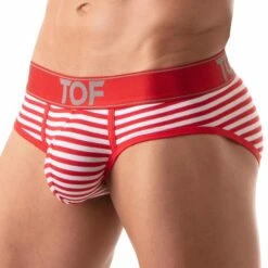 Slip taille basse en coton stretch imprimĂ© d’une Ă©lĂ©gante rayure façon mariniĂšre. Grande poche frontale non doublĂ©e. Ceinture Ă©lastique jacquard signĂ©e TOF. Fabrication française.