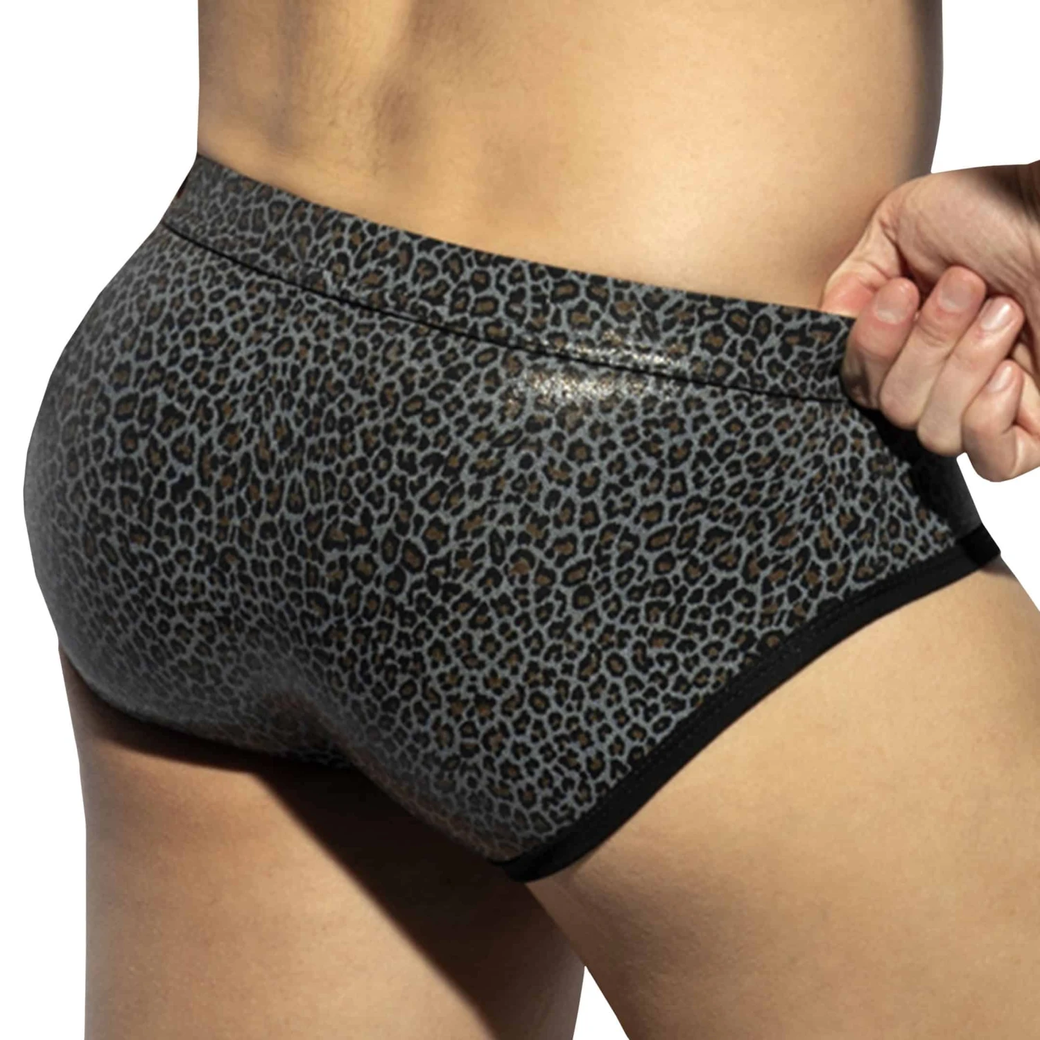 Slip sexy et confortable en microfibre laminée brillante. Imprimé léopard. Bordures de couleur contrastée. Poche frontale non doublée de grande capacité. Ceinture élastique avec étiquette en silicone ES Collection.