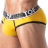 Slip taille basse en coton extensible. Coupe tanga trÚs ajustée. Grande poche frontale non doublée. Bordures de couleur contrastée. Ceinture élastique jacquard signée TOF GEAR. Fabrication française.