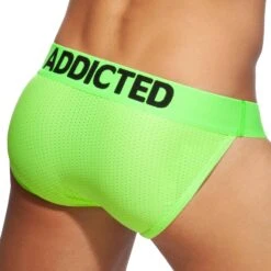 Slip tanga taille basse révolutionnaire en mesh sport, léger et respirant de couleur fluo. Technologie RingUp intégrant un anneau cock ring en silicone (diamÚtre 5 cm, amovible par bouton pression) pour une érection plus dure et plus longue. Poche frontale push up pour mettre en avant votre masculinité, tout en assurant un maintien trÚs confortable. Ceinture élastique contrastée signée Addicted.