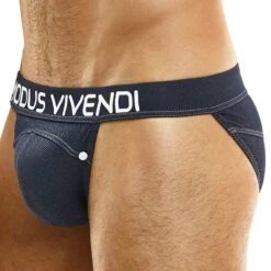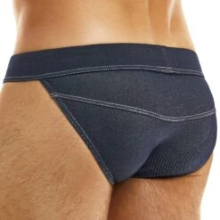 Slip tanga taille basse en mélange de viscose et de microfibre douce et agréable à porter. Imprimé et coutures imitant le jeans. Poche frontale doublée. Rivets métalliques. Logo Modus Vivendi en silicone sur la ceinture élastique recouverte.