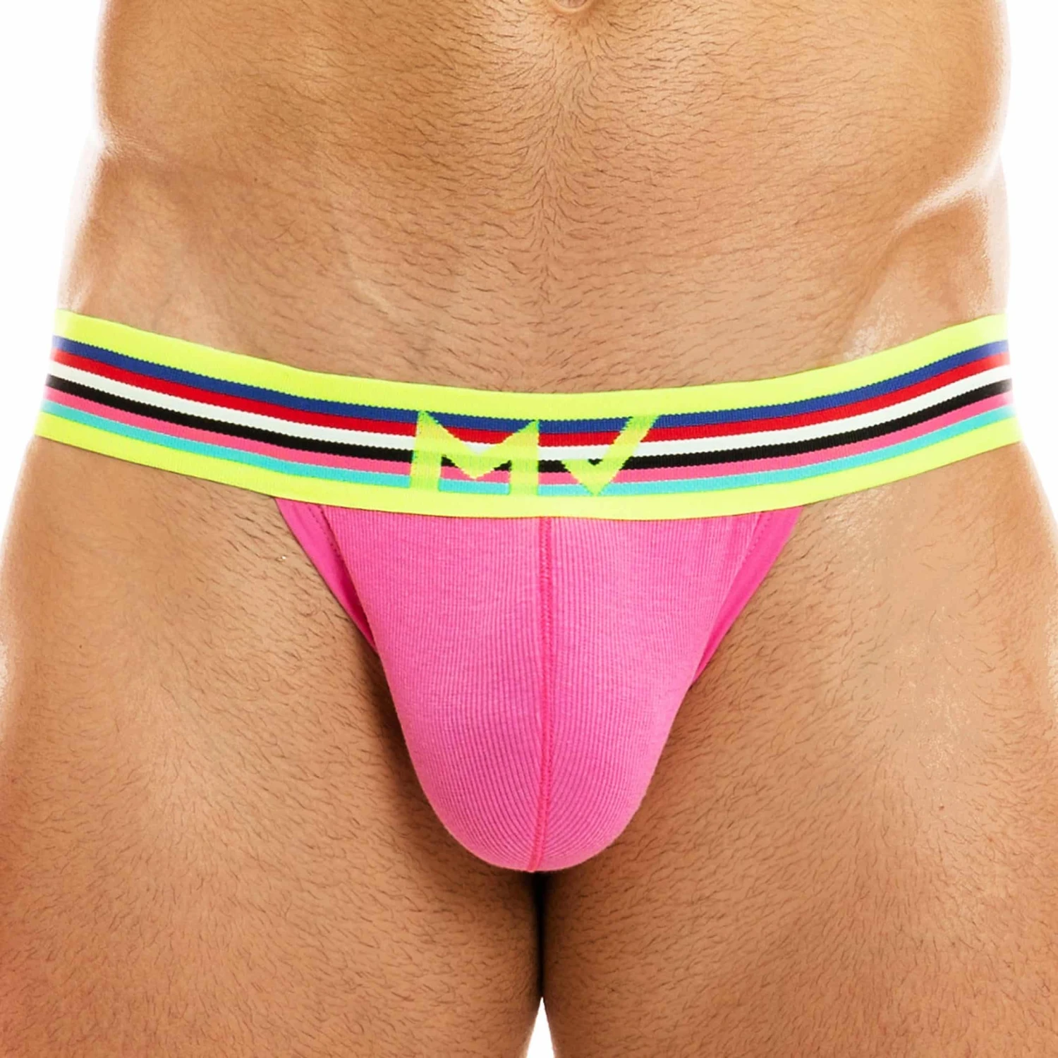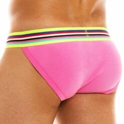 Slip taille basse en coton cĂŽtelĂ©, doux et confortable, de couleur intense. Coupe tanga trĂšs sexy. Ceinture Ă©lastique rayĂ©e aux couleurs de l’arc-en-ciel.