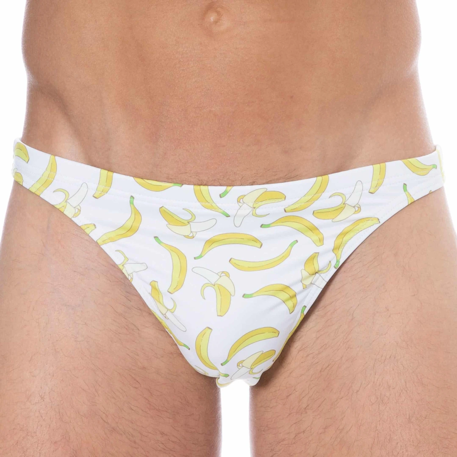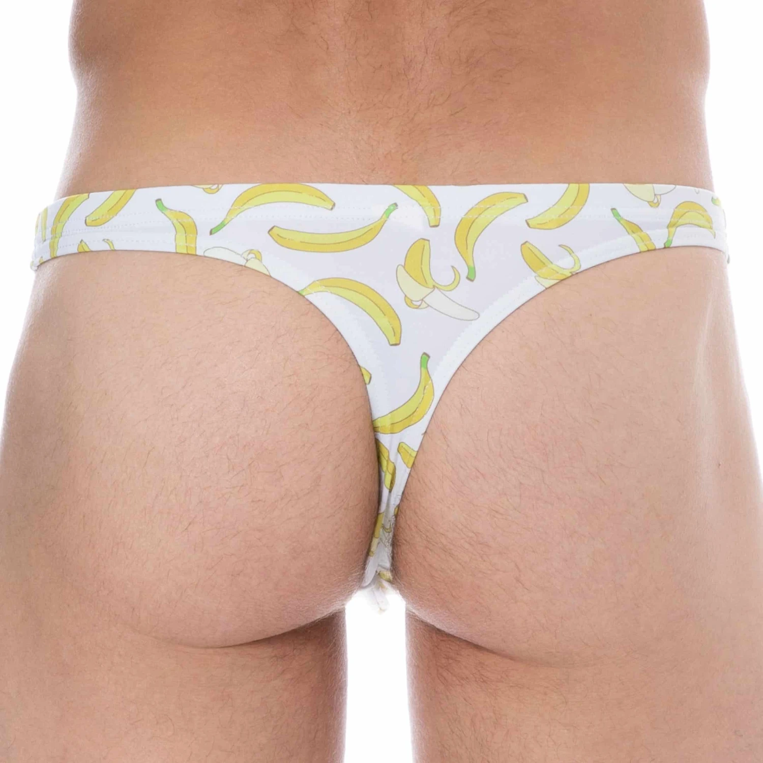 String de bain trÚs sexy en microfibre extensible et résistante, séchant rapidement. Imprimé original et provocant constitué de bananes. Coupe taille basse et trÚs ajustée. EntiÚrement doublé. Ceinture élastique. Fabrication 100% italienne.