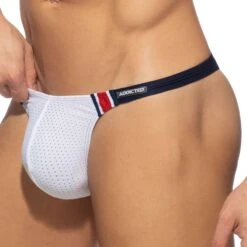 String taille basse en microfibre fine. Bandes sport tricolores autour de la poche frontale. Poche frontale en mesh respirant. Logo Addicted en silicone sur le cÎté gauche. Fine ceinture élastique recouverte.