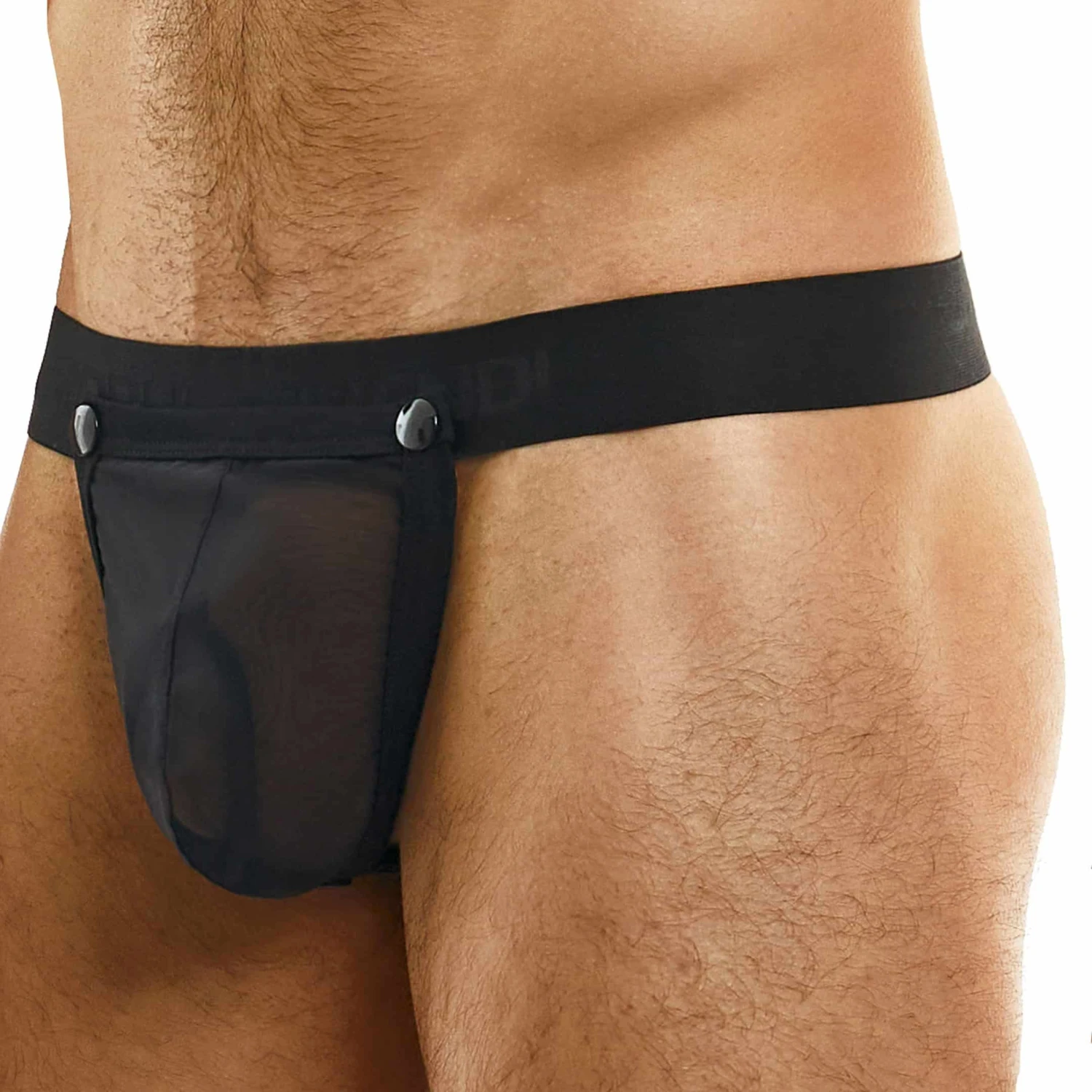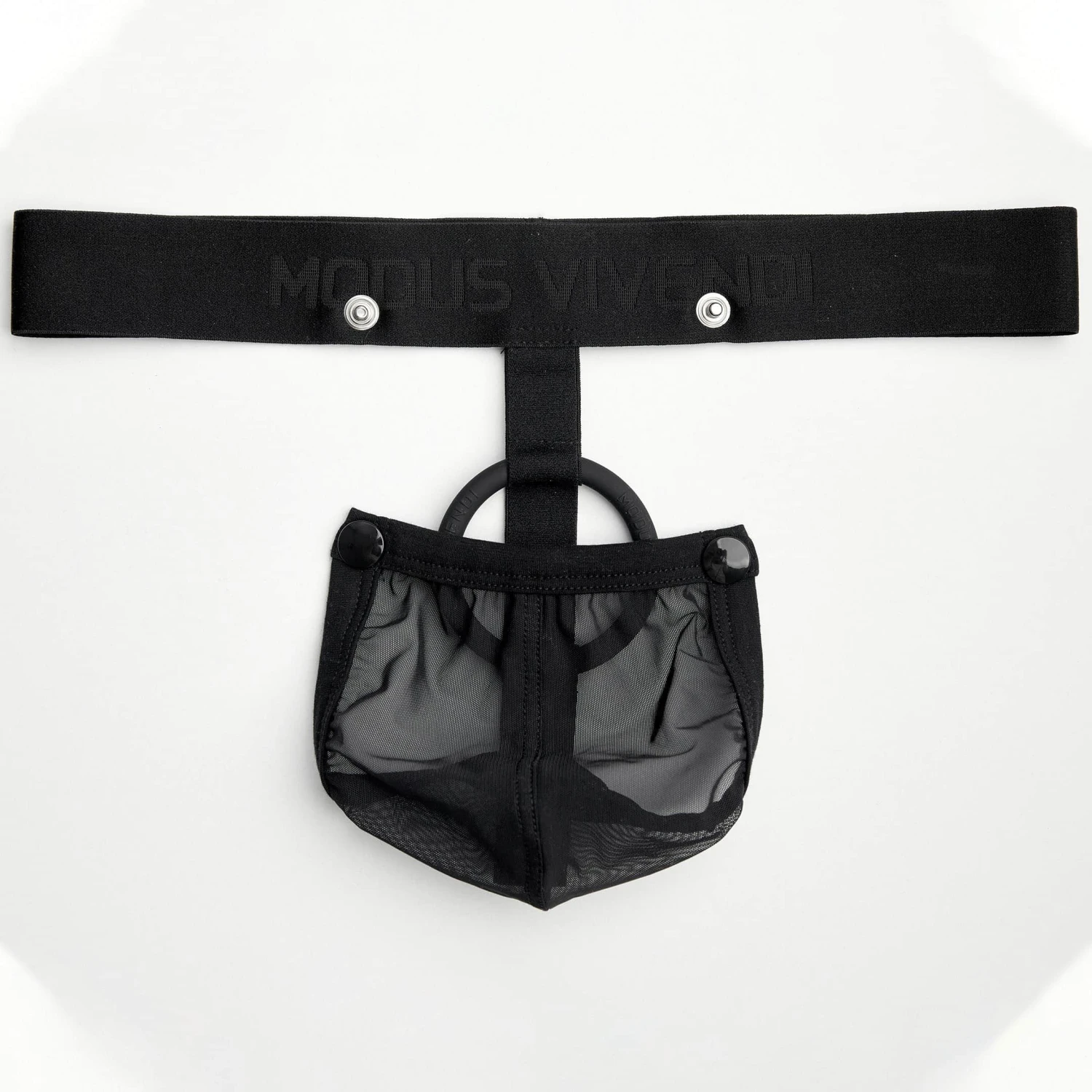 String ultra sexy et provocant intégrant un cock ring en gomme (diamÚtre interne 5,5 cm). Grande poche frontale en résille transparente amovible par 3 boutons-pression. Ceinture élastique signée Modus Vivendi ton-sur-ton.