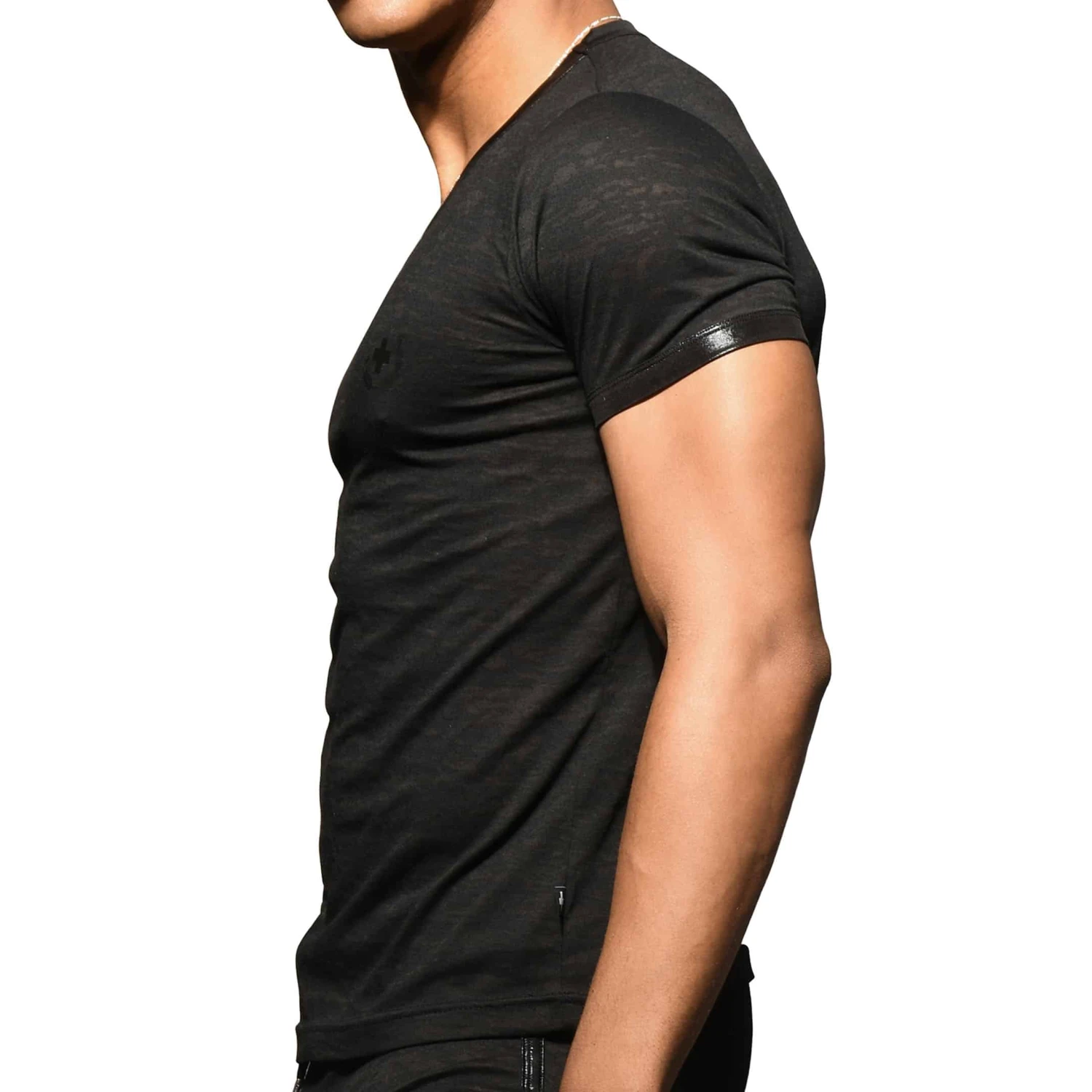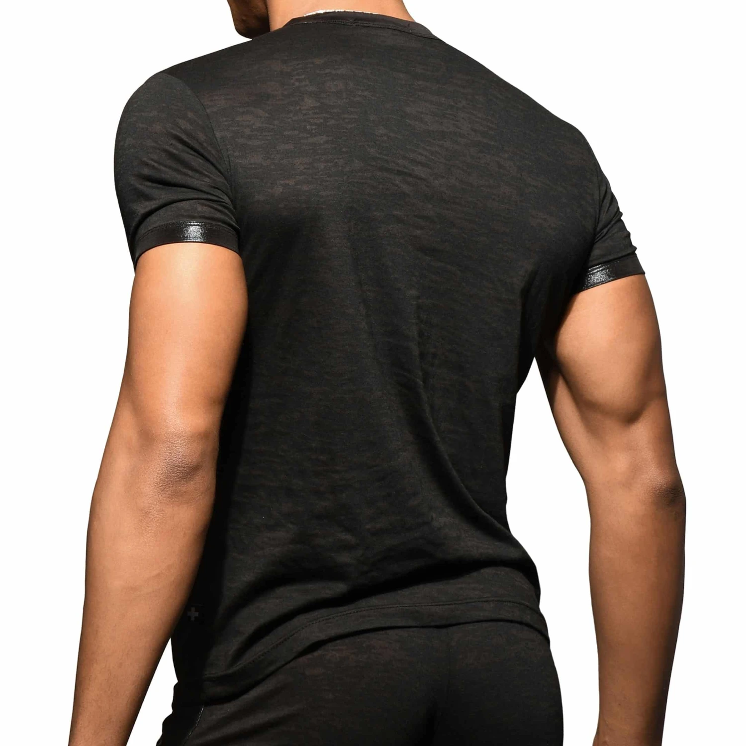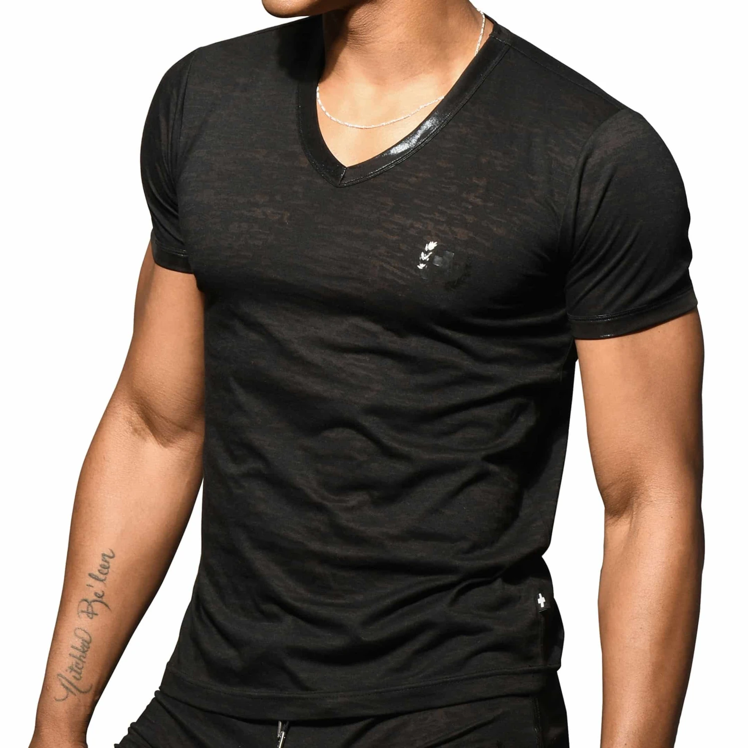 T-shirt en tissu dévoré trÚs doux et légÚrement transparent. Coupe ajustée et col en V. Bordures des manches et du col en simili-cuir. Couronne de laurier en silicone sur la poitrine. Edition limitée.