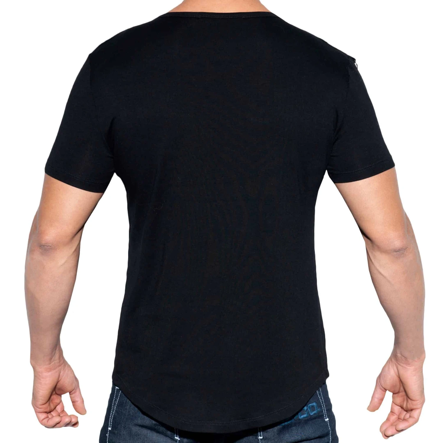 T-shirt en viscose douce et soyeuse de couleur unie. Coupe courte et ajustée, arrondie en bas pour tomber parfaitement sur un pantalon. Col en V et manches courtes. EmpiÚcement avec anneau métalique sur chaque épaule. Patch militaire ES Collection décoré de chaßnettes sur la poitrine.