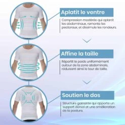 T-shirt amincissant, dont la structure gainante affine la taille, tout en apportant apporte un support dorsal et une amélioration de la posture. Conçu en microfibre hautement extensible pour un usage au quotidien, comme pour la pratique sportive. Compression modérée qui aplanit les abdominaux et dissimule les rondeurs disgracieuses, tout en restant confortable. Grâce à son encolure large et ses manches courtes, il reste invisible sous votre chemise, pullover ou t-shirt.