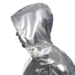 Crop top à capuche en microfibre stretch métallisée brillante et laminée. Cordons de serrage élastiques sur la capuche et à la base du crop top. Manches courtes. Logo AD en silicone sur la poitrine.