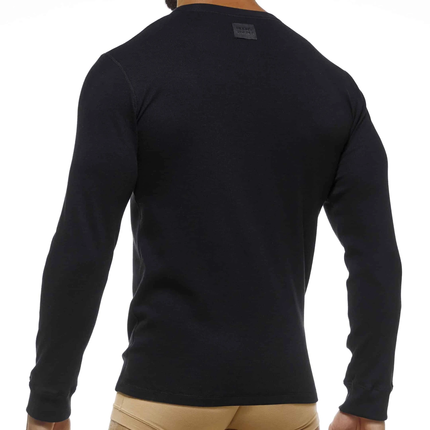 T-shirt éco-responsable en coton cÎtelé 100% biologique. Répond aux normes GOTS et OCS. Coupe droite. Manches longues. Col tunisien à 4 boutons. Logo cousu en haut du dos.