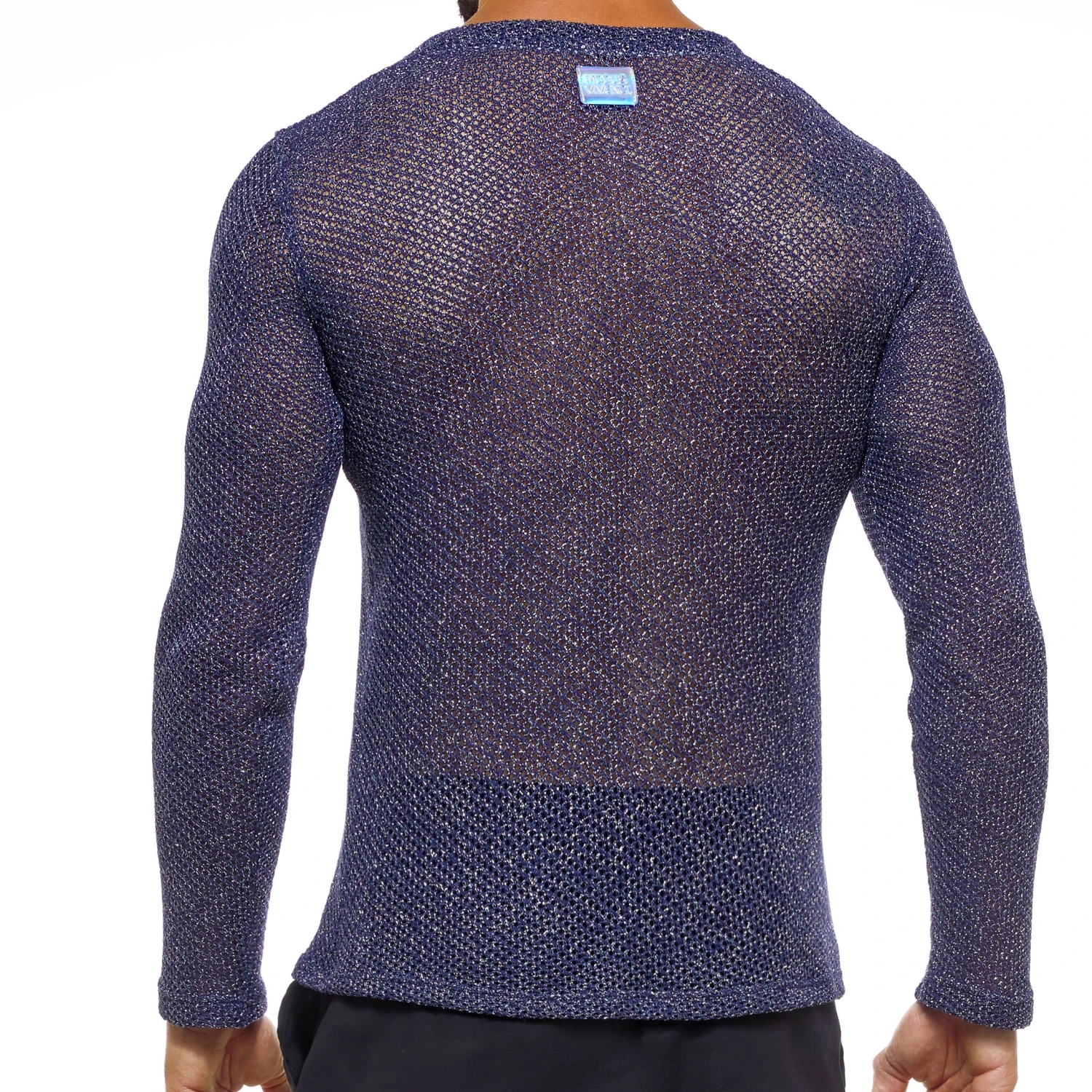 T-shirt transparent en tissu tricoté extensible contenant des fils métallisés Lurex, pour un parfait effet cotte de mailles. Coupe ajustée avec col en V profond et manches longues. Etiquette Modus Vivendi cousue dans le dos. Fabriqué en GrÚce.