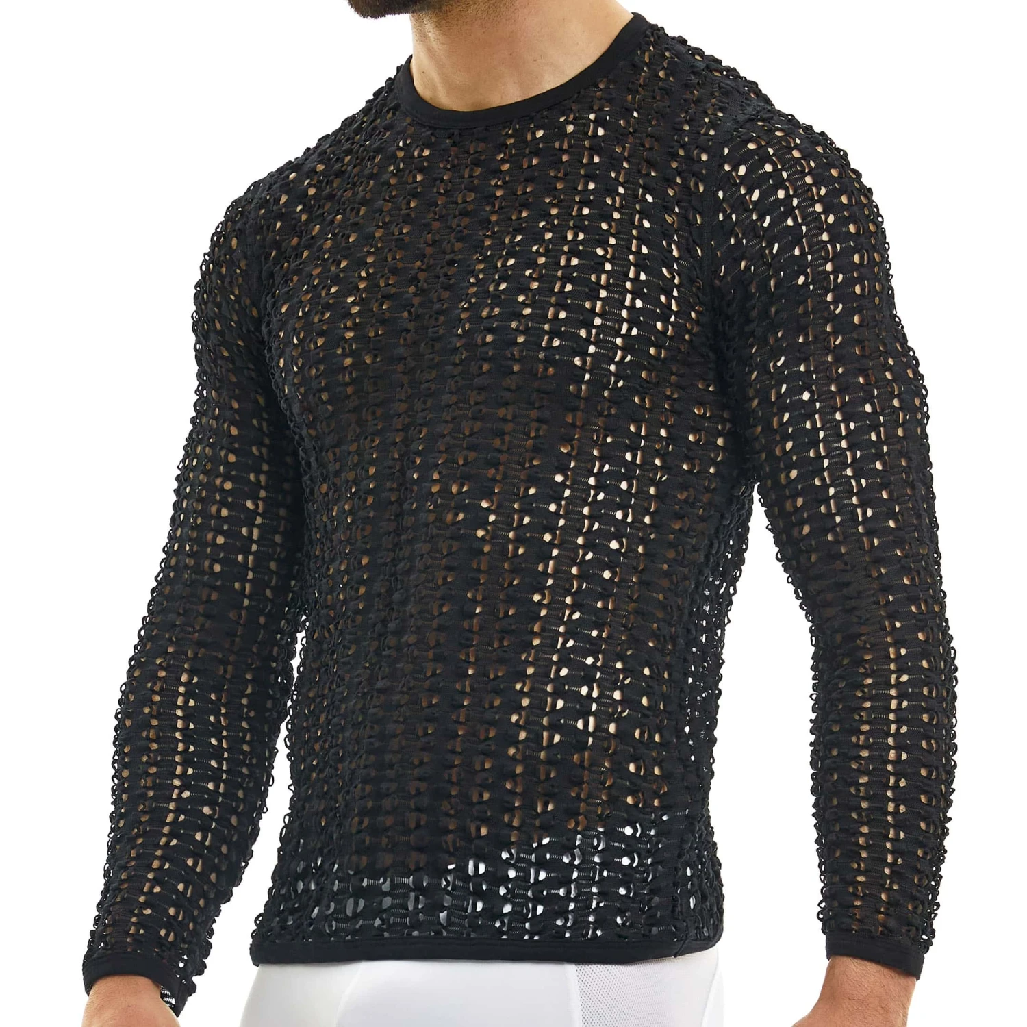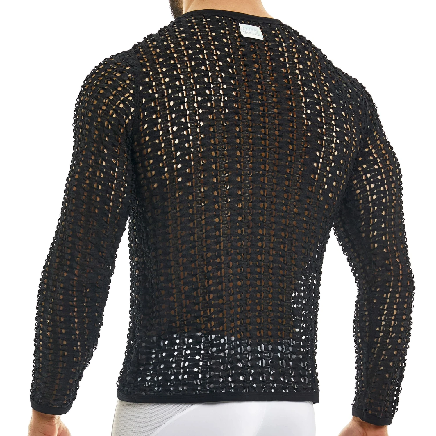 T-shirt à manches longues monochromatique et sophistiqué inspiré des années 70. Tissu tricoté façon crochet. Encolure ras du cou. Logo holographique Modus Vivendi cousue au dos.