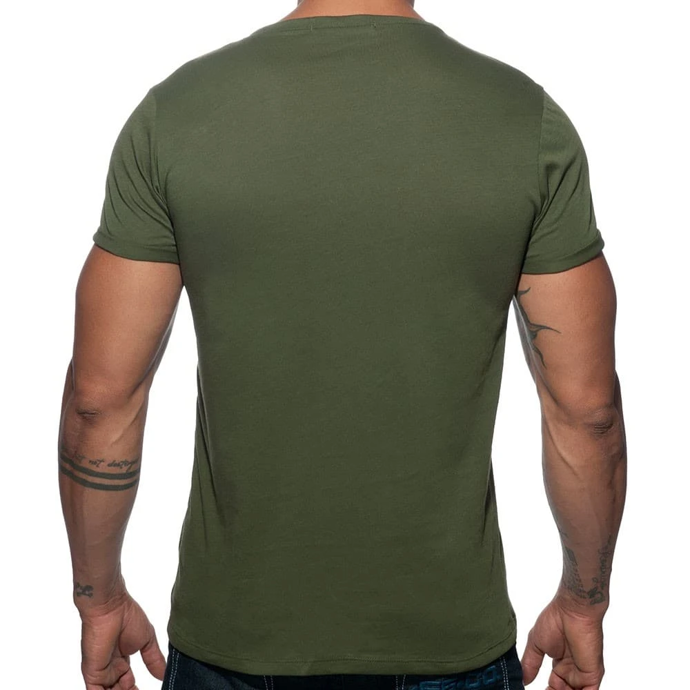 T-Shirt en pur coton doux et confortable. Coupe ajustée, manches courtes et col en V. Badge militaire et logo Addicted brodés sur la poitrine. Fabriqué à Barcelone.