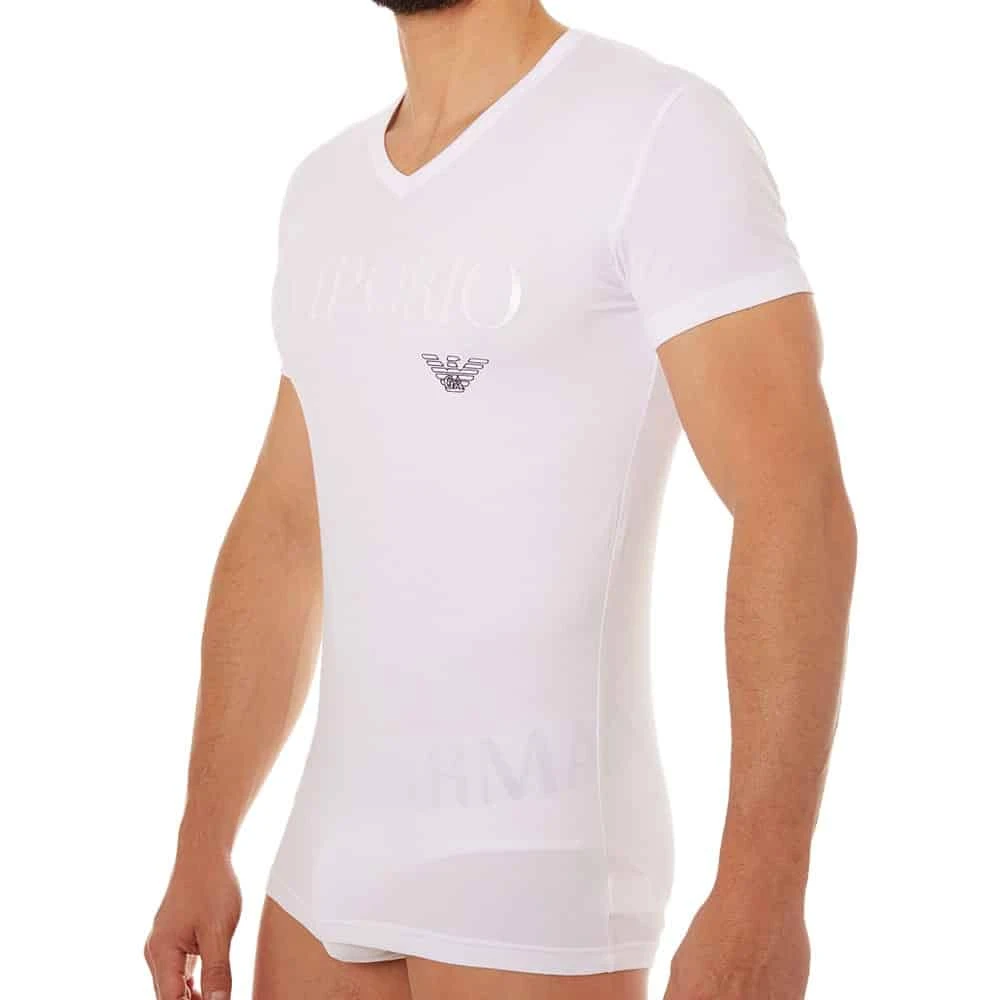 T-Shirt en coton extensible trÚs doux et confortable. Coupe ajustée et élégante. Manches courtes et col en V. Grand logo Emporio Armani en silicone sur la poitrine et dans le dos.
