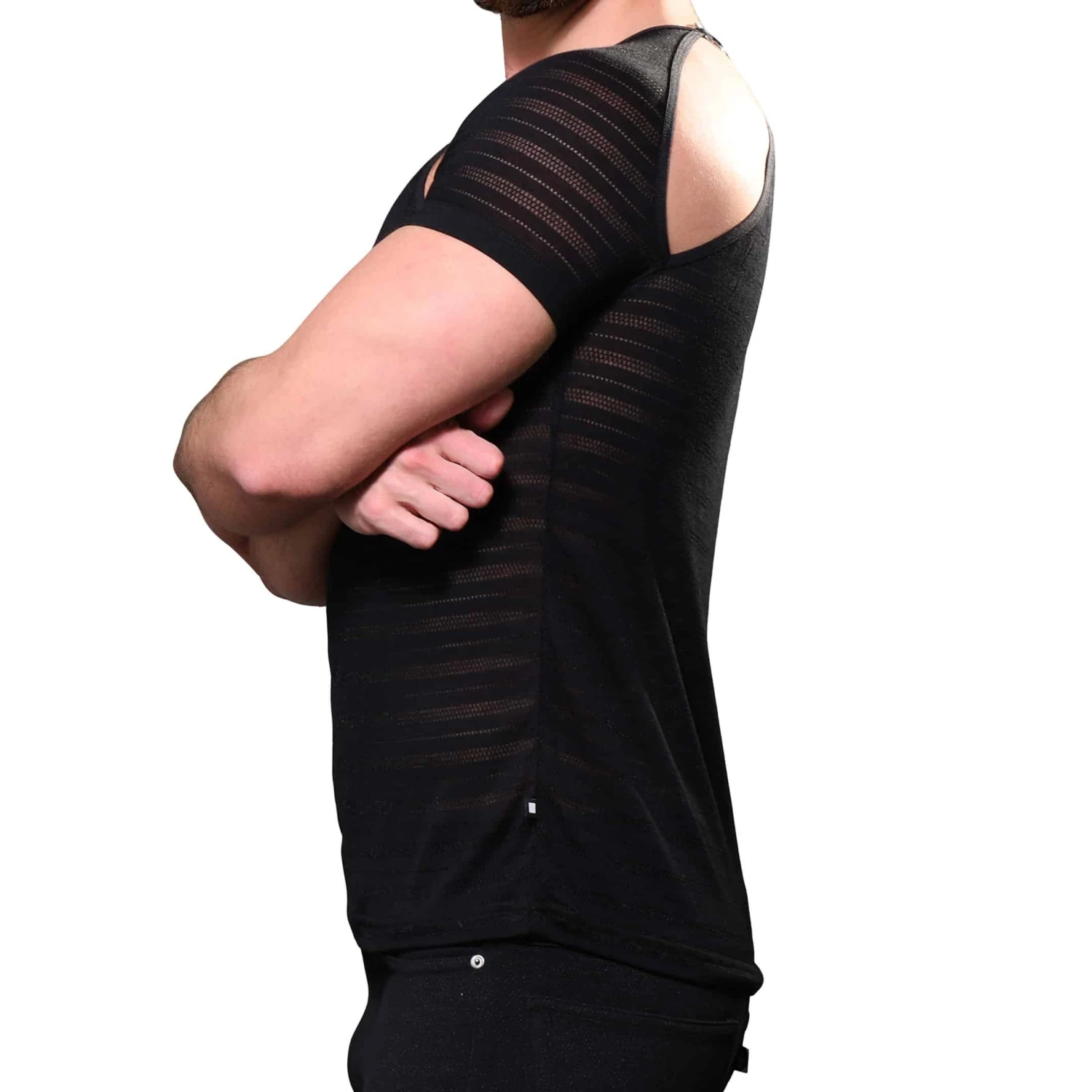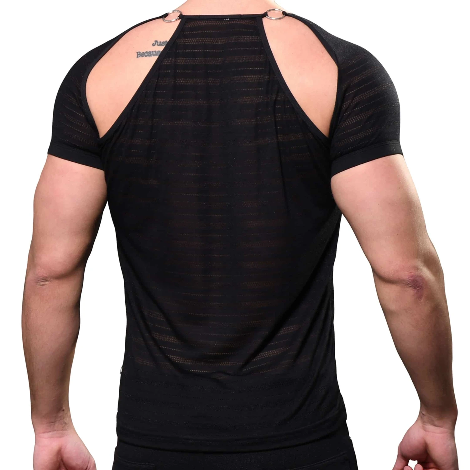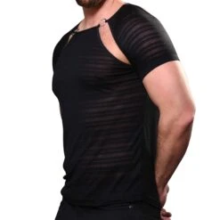 T-shirt sexy en coton dévoré. Rayures horizontales semi-transparentes. Coupe ajustée pour mettre en valeur votre anatomie. Découpes originales maintenues par 4 anneaux métalliques. Manches raglan. Edition limitée.