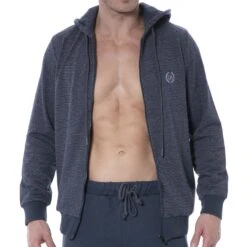 Tenue d’intĂ©rieur en matiĂšre douce et confortable. Pantalon avec 2 poches, ceinture Ă©lastique et cordon de serrage. Veste Ă manches longues et capuche en jacquard tricotĂ©, avec fermeture Eclair intĂ©grale et deux poches.
